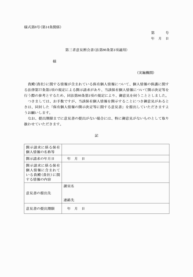 (1) 法第86条第1項の規定による照会 第三者意見照会書(法第86条第1項適用)(様式第8号)